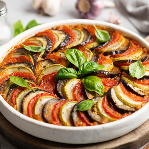 • Ratatouille z cukinią, papryką, falafelem i hummusem. Klasyka kuchni francuskiej w wegetariańskim wydaniu. Delikatne warzywa duszone w aromatycznym sosie pomidorowym, podane z chrupiącym falafelem i kremowym hummusem. Lekko, smacznie i zdrowo.